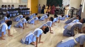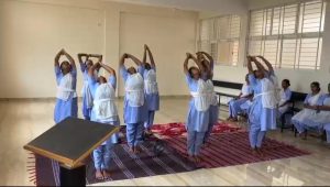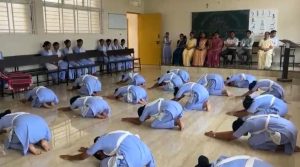 Principal Prof. Naveen Rasquinha addressed the gathering with motivating words and emphasized the importance of incorporating yoga into daily life for overall health and balance.